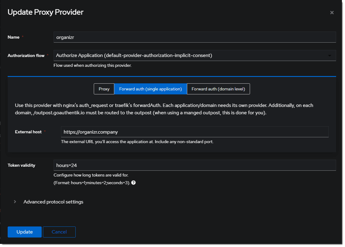 1. Create a new Proxy Provider for https://organizr.company Optionally, add the regular expression to allow api calls in the advanced protocol settings.