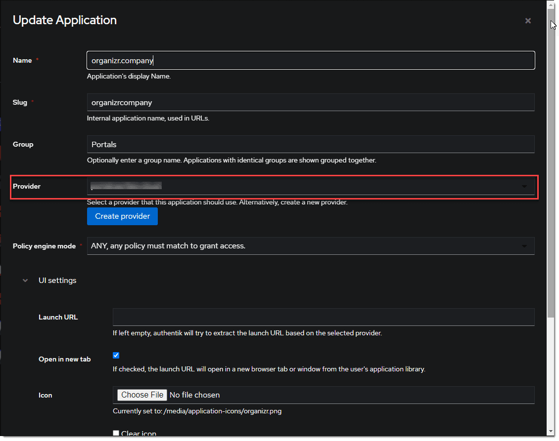 2. Create a new Application for the https://organizr.company Provider.