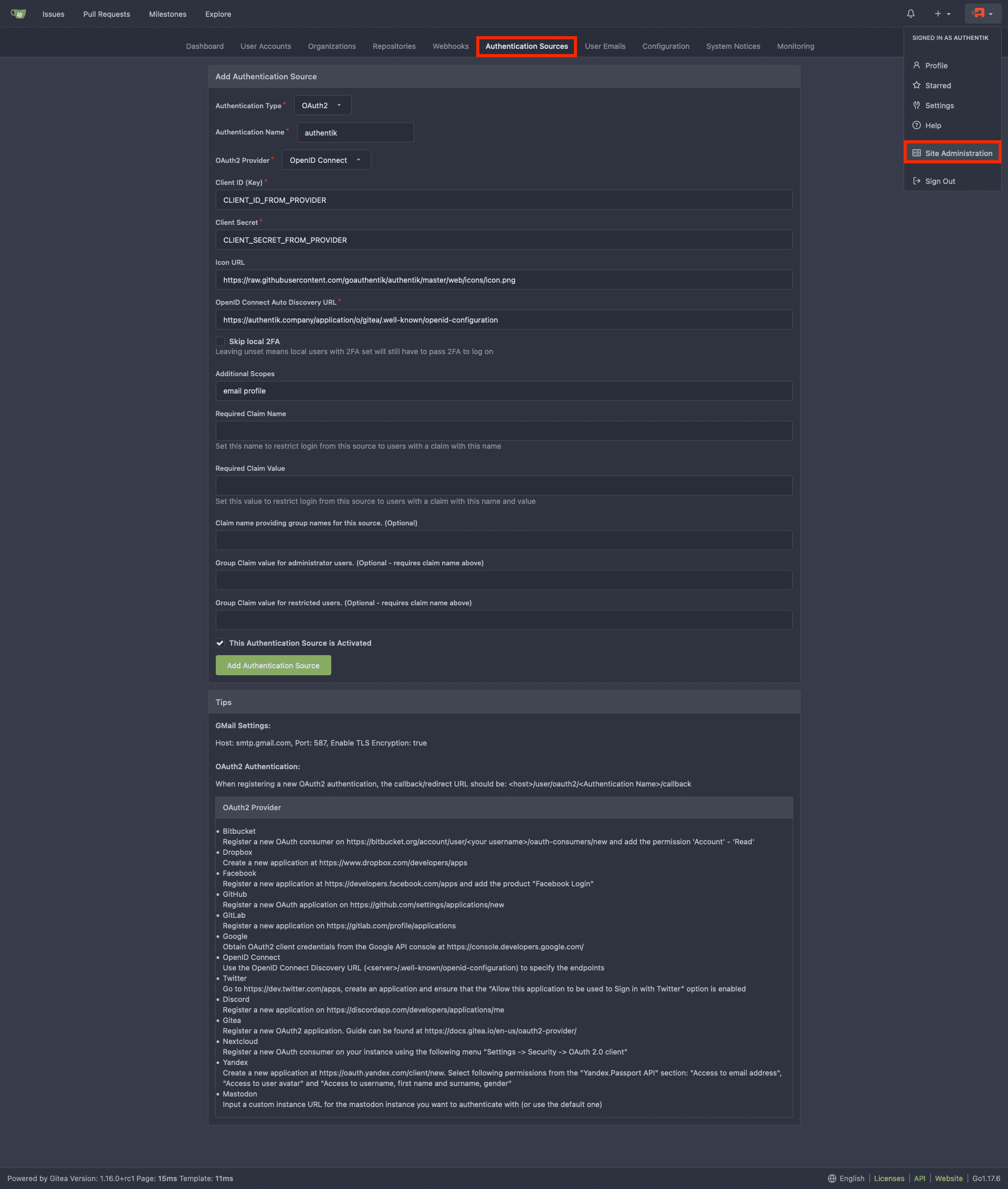 • Additional Scopes: email profile gitea